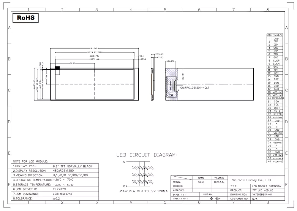 TFT LCD es un tipo de pantalla de cristal líquido que utiliza tecnología de transistores de película delgada para mejorar la calidad de la imagen, y tiene numerosas aplicaciones en la vida cotidiana. Como fabricante y proveedor de módulos TFT profesionales en China, ¿qué hace que el módulo TFT de 480 × 1280 IPS de 6.86 pulgadas de 6.86 pulgadas sea diferente de otros fabricantes? Al principio, ofrece un brillo típico de 450cd/m², 16,7 m de colores, un amplio ángulo de visión de 80 ° (típico) en todas las direcciones y una relación de contraste de 800: 1, asegurando una excelente legibilidad desde varios ángulos. En segundo lugar, integra una unidad de luz de fondo que utiliza 3 × 4 LED blancos con una vida útil típica de 30,000 a 50,000 horas (al 50% de brillo inicial), lo que garantiza una clara visibilidad en todas las condiciones de iluminación. Además, utiliza una interfaz MIPI DSI de 4 carriles para la transferencia de datos de alta velocidad e integración simplificada. Además, pasa pruebas ambientales rigurosas, que incluyen almacenamiento y operación de alta temperatura, ciclo de temperatura, pruebas de calor húmedo (humedad) para que pueda funcionar a la perfección en un rango de temperatura extendido de -20 ° C a +70 ° C.