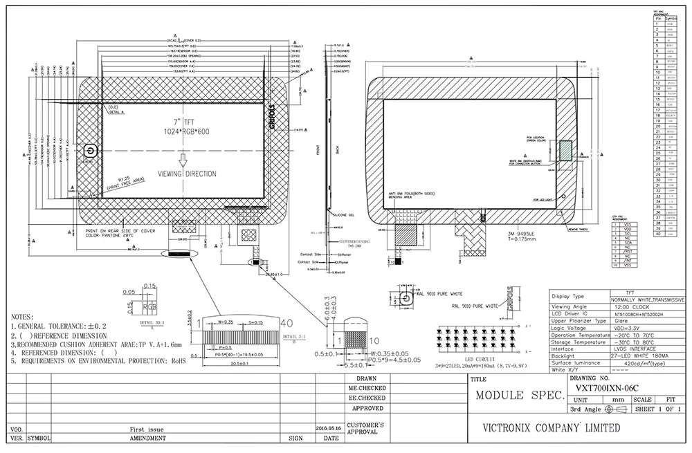 En la era de la inteligencia, el módulo TFT nos permite presentar los datos requeridos visualmente. La calidad del módulo TFT tiene un impacto crítico en su aplicación. ¿Cuáles son las ventajas del módulo LCD Victronix de 7 pulgadas 1024 × 600 normalmente blanco? Al principio, utiliza un alto brillo de 420 CD/m² con el mejor ángulo de visión a las 12 en punto para imágenes vívidas y precisas. En segundo lugar, admite una interfaz LVDS con NT5100BCH+NT52002H Driver IC, y una luz de fondo de 27 Led con una vida útil de 50,000 horas, asegurando su usabilidad a largo plazo en varias aplicaciones industriales. Además, cumple con los estándares de ROHS y pasa con éxito las rigurosas pruebas de confiabilidad, incluidos el choque térmico, la humedad y la protección de ESD hasta 8 kV de aire y 4KV de contacto. Este producto funciona de manera eficiente a temperaturas extremas que van desde -20 ° C a +70 ° C.