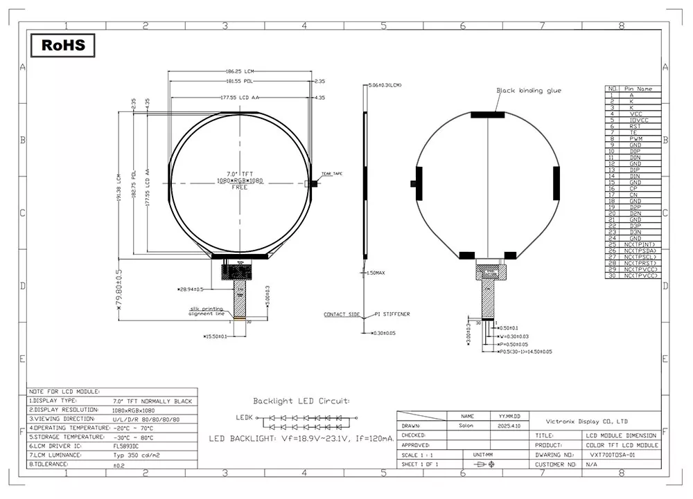 El módulo TFT se puede encontrar en todas partes en la vida. ¿Qué hace que este Victronix de 7 pulgadas 1080 × 1080 redondo IPS TFT LCD sea diferente de otros fabricantes? Al principio, su brillo de 500 CD/m², la relación de contraste de 800: 1 y los ángulos de visualización de 80 ° en todas las direcciones aseguran imágenes vívidas. En segundo lugar, el dispositivo admite una interfaz MIPI de 4 carriles con el controlador FL5893DC para la transferencia de datos de alta velocidad. Además, presenta una luz de fondo LED blanca con una vida útil de 30,000 a 50,000 horas, lo que garantiza un rendimiento confiable en diversas aplicaciones industriales. Además, cumple con los estándares de ROHS y pasa pruebas de confiabilidad rigurosas (choque térmico, humedad, almacenamiento) para operar perfectamente a temperaturas extremas (-20 ° C a +70 ° C) y resistir condiciones de almacenamiento duras (-30 ° C a +80 ° C).