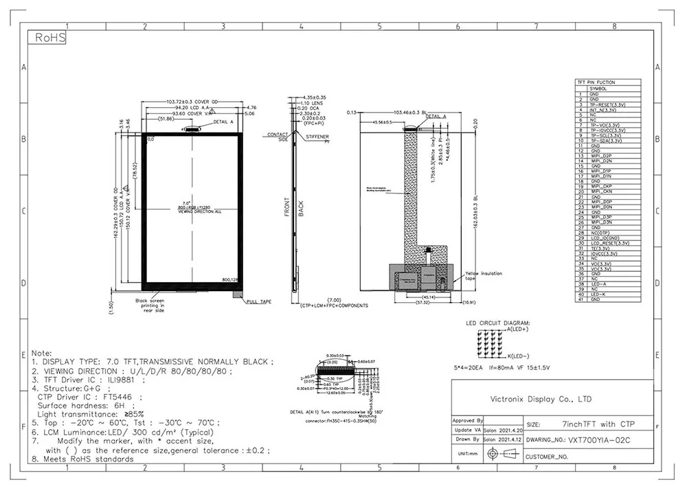 VXT700YIA-02C es un módulo TFT-LCD. Está compuesto por un panel TFT-LCD, el controlador IC, FPC, una luz posterior y CTP. El área de visualización de 7.0 ¢ ¢ ¢ contiene 800 x (RGB) x 1280 píxeles y puede mostrar hasta 16.7m colores. Este producto concuerda con el criterio ambiental de ROHS.