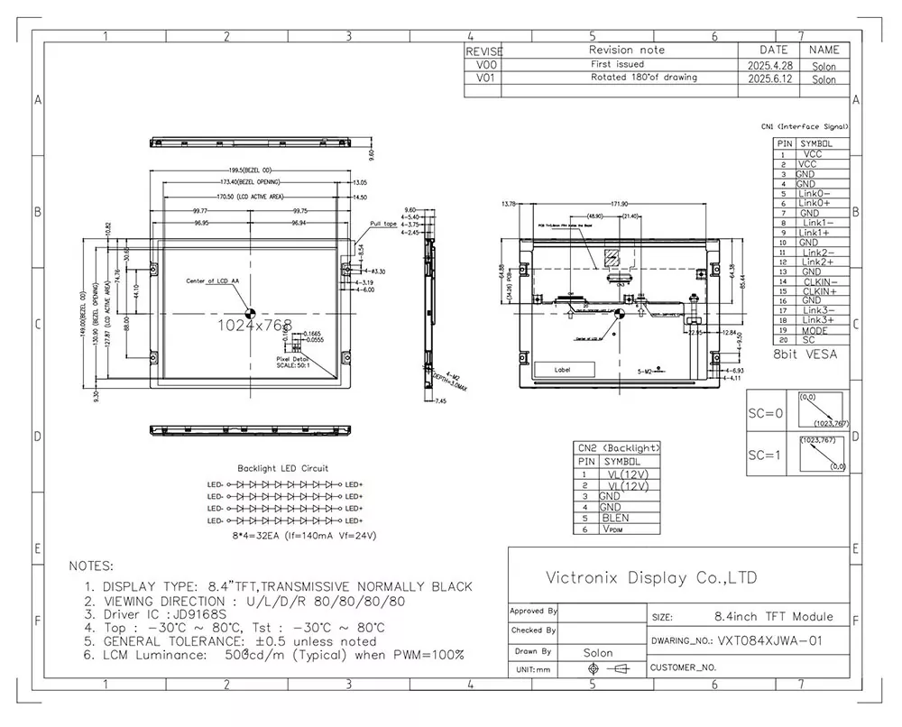 TFT LCD es un tipo de pantalla de cristal líquido que utiliza tecnología de transistores de película delgada para mejorar la calidad de la imagen, y tiene numerosas aplicaciones en la vida cotidiana. Como fabricante y proveedor profesional del módulo TFT en China, ¿qué hace que Victronix 8.4 pulgadas 1024 × 768 IPS TFT LCD sea diferente de otros fabricantes? En primer lugar, ofrece un brillo típico de 500 CD/m², ángulos de visión de 85 ° de ancho de todas las direcciones y una relación de contraste de 1500: 1, lo que garantiza una excelente legibilidad desde varios ángulos. En segundo lugar, integra una unidad de luz de fondo que utiliza 32 LED blanco con una vida útil típica de 50,000 horas (al 50% de brillo inicial), asegurando una clara visibilidad en todas las condiciones de iluminación. Además, admite la interfaz LVDS con la protección ESD y el controlador JD9168S. Además, pasa pruebas ambientales rigurosas, incluido el choque térmico (-30 ° C ↔ +80 ° C ciclos), el almacenamiento de humedad (60 ° C/90% HR) y la vibración mecánica, asegurando que pueda funcionar a la perfección en un rango de temperatura extendido (-30 ° C a +80 ° C).
